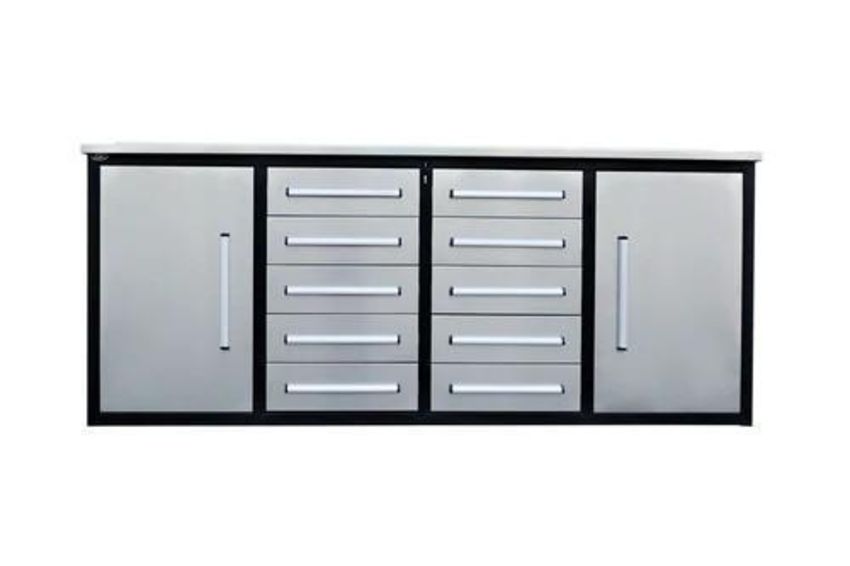 This Steelman 7ft storage cabinet with workbench is for space-saving and organization in the garage, storage room, basement, hobby room, laboratory, office, and other applications. Drawers with locks are helpful for storing miscellaneous work supplies, and you can store some bigger-shaped items in the cabinet. This industrial-grade roller cabinet was designed, tested, and built to last. This unit gives you the flexibility to organize a wide variety of tools with narrow, wide, and extra-wide drawer options. The industrial paint finish is durable, easy to clean, and looks great in any garage. (Slight Shipping Damage - See Picture)